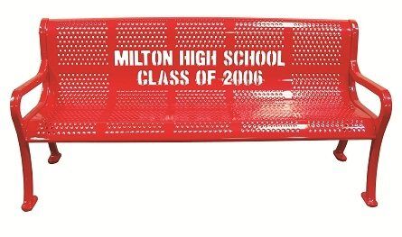 Personalized Multicolor Perforated Bench. Customized logo or words manufactured into the bench back. Secondary color behind customized logo.